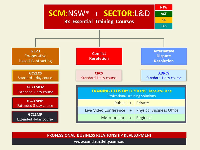 CONSTRUCTIVITY Professional Training Solutions: Comprehensive advisory services spanning Government Construction Procurement, Prequalification incl: Contractors (SCM0256, SCM1461, SCM100002); Consultants (SCM1191, SCM10611), Relationship development and construction work opportunities. Access extensive, unique, impartial insight into GC21 and MW21 standard form contracts including General Conditions; Special conditions, QA-SPECS and Bespoke contracting arrangements. Coverage of State, Territory, Local Government, TfNSW (C2-GC21) versions, amendments, adaptations, variants plus extended Collaborative Contracting arrangements under GC21.